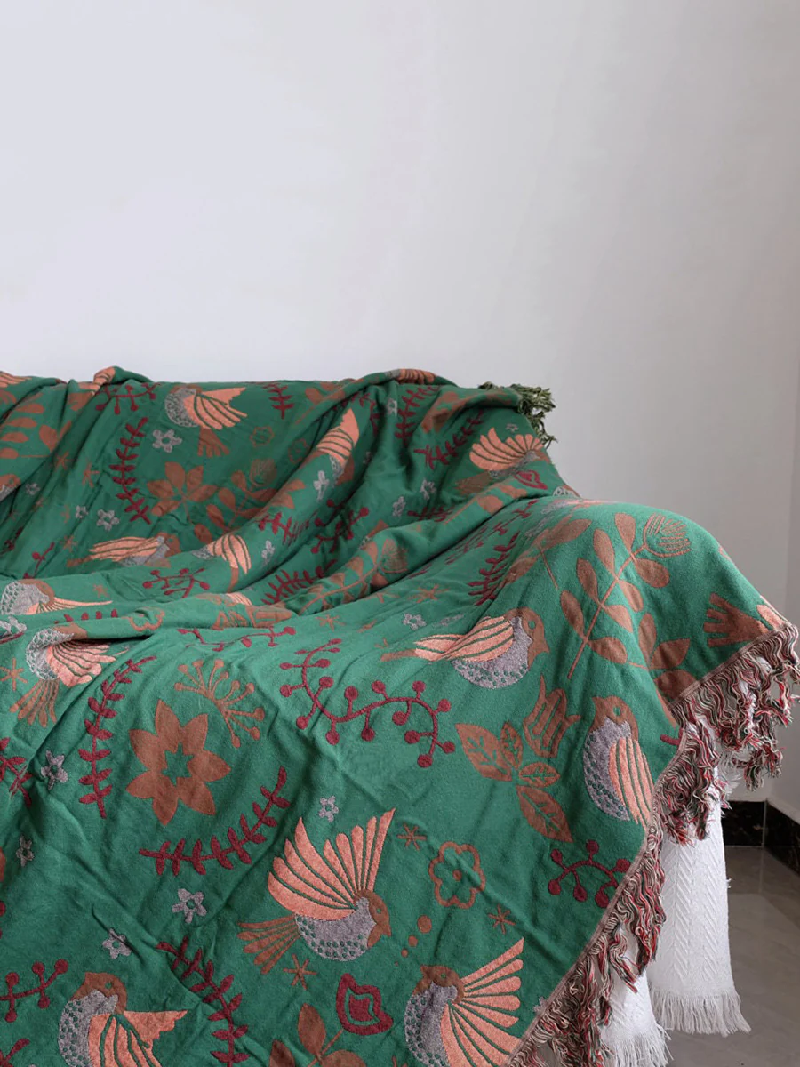 This cozy blanket is perfect for snuggling up on the couch, or taking along on a chilly camping trip. The dual-sided design features a colorful bird pattern on one side, and other color on the other. Made from 100% cotton fibers, this blanket is breathable and retro-inspired. The perfect addition to any boho-chic home!