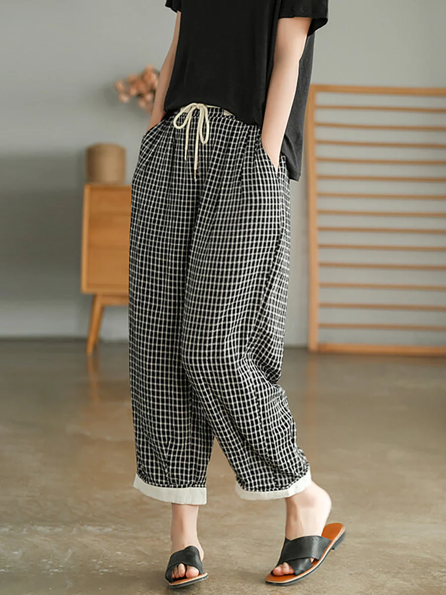 Plus Size Women Plaid Drawstring Pocket Casual Pants—