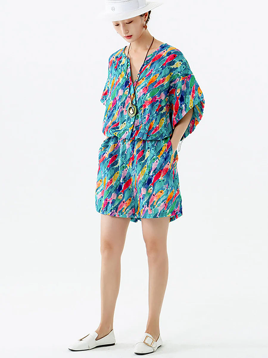 Plus Size - Women Drawstring Pocket Breasted Short Rompers