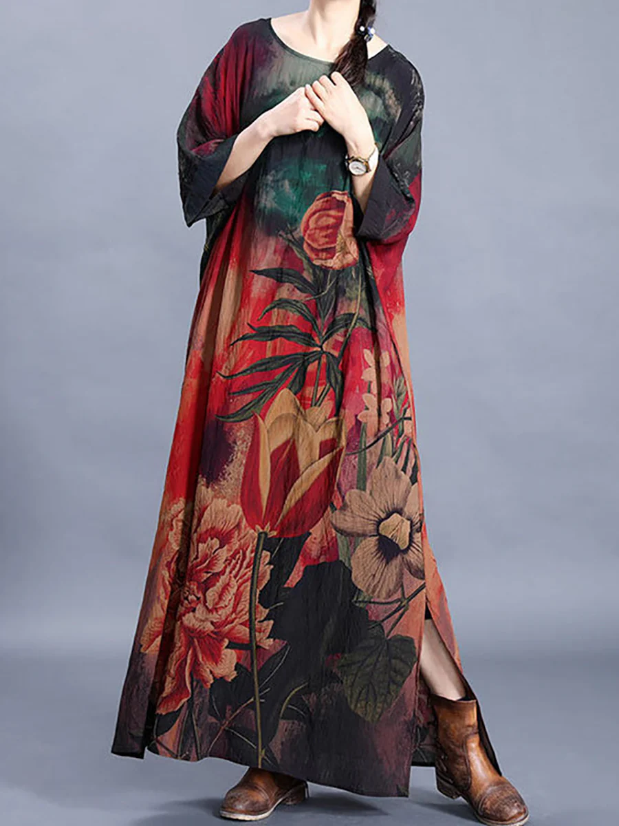 Plus Size Women Causal Retro Floral Maxi Dress