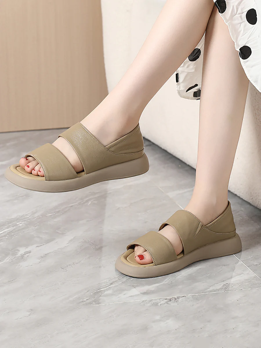 Women Summer Solid Leather Soft Flat Peep-toe Shoes